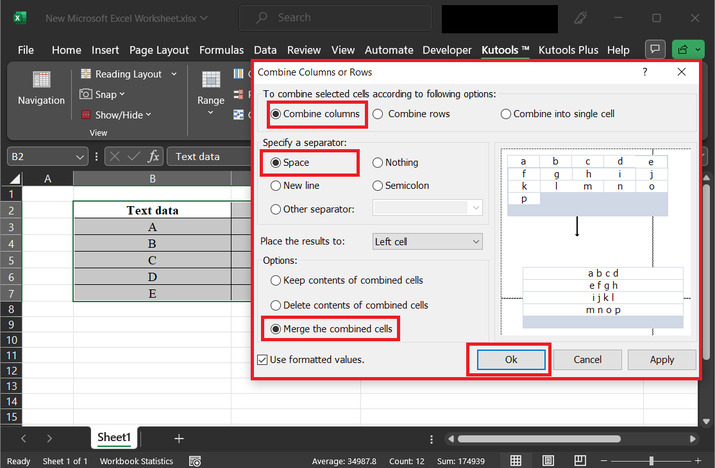 上述步驟將顯示一個對話方塊“合併列或行”。在開啟的對話方塊中,單擊“合併列”按鈕。在“指定分隔符”標籤中,單擊“空格”按鈕。之後在選項區域中,單擊“合併合併單元格”選項。之後單擊“確定”按鈕。