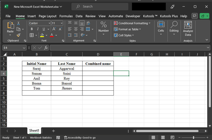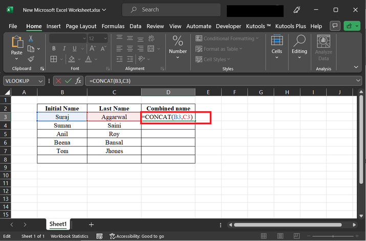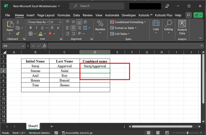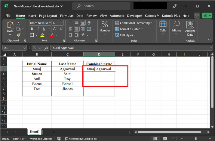 在“合併列”單元格中,鍵入如下所示的完整名稱輸出。對於此示例,名字是“Suraj”,姓氏是“Aggarwal”,在合併輸出列中寫入資料為“Suraj Aggarwal”。