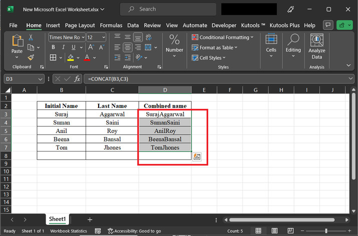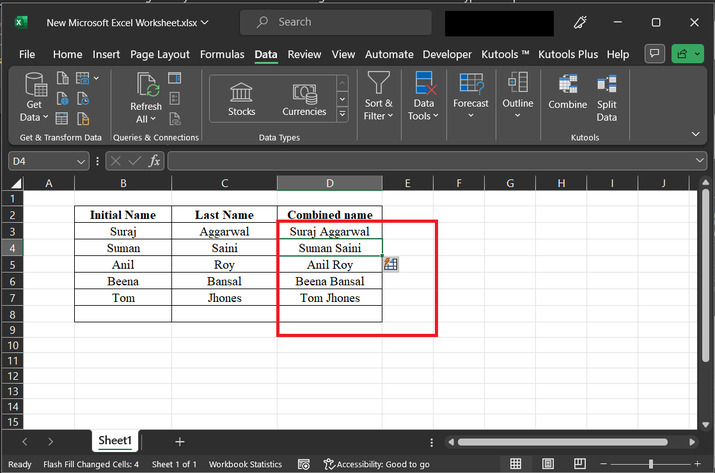 需要注意的是,快速填充功能允許使用者使用以前的資料值生成新值。因此,為了獲得更準確的結果,使用者需要提供兩到三個樣本。接下來的示例描述了使用kutools合併兩列。這裡另一個需要注意的重要點是,kutools允許使用者在新增資料時插入空格、逗號、分隔符等等。要獲得更清晰的資訊,請參考本教程的第三個示例。