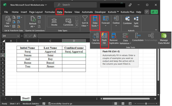 在本例中,使用者將瞭解快速填充功能的使用。此功能基於人工智慧。它讀取提供的資料並相應地生成結果。另一個需要考慮的重要點是,此功能僅在最新版本的Excel中可用。舊版本的Excel不提供此功能。要更精確地瞭解,請考慮以下步驟。