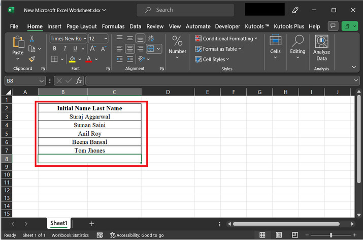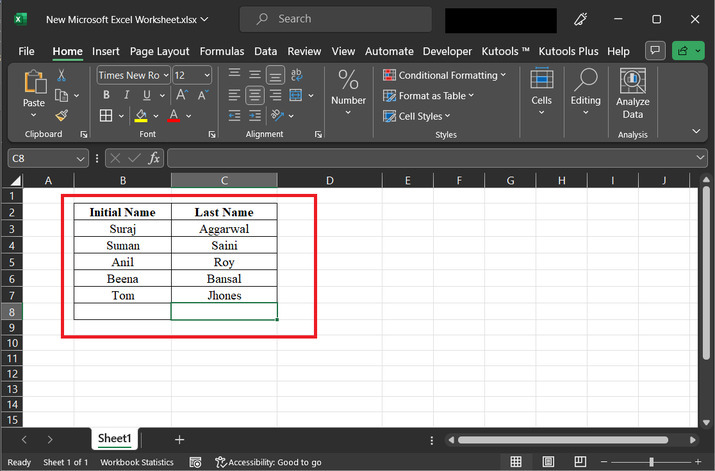 請考慮以下提供的Excel電子表格。開啟的Excel表格包含兩列。這裡,第一列包含名字,姓氏列包含姓氏。