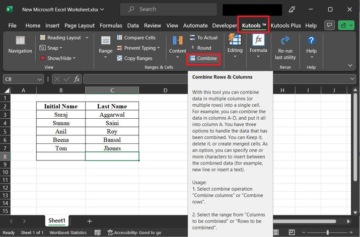示例3:使用Excel中的Kutools將名字和姓氏合併到同一個單元格中