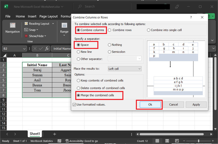 上述步驟將開啟一個“合併列或行”對話方塊。在開啟的對話方塊中,單擊第一個單選按鈕“合併列”。在第二個標籤“指定分隔符”中,單擊“空格”單選按鈕。在選項標籤中,單擊“合併合併單元格”選項。最後,單擊“確定”按鈕。