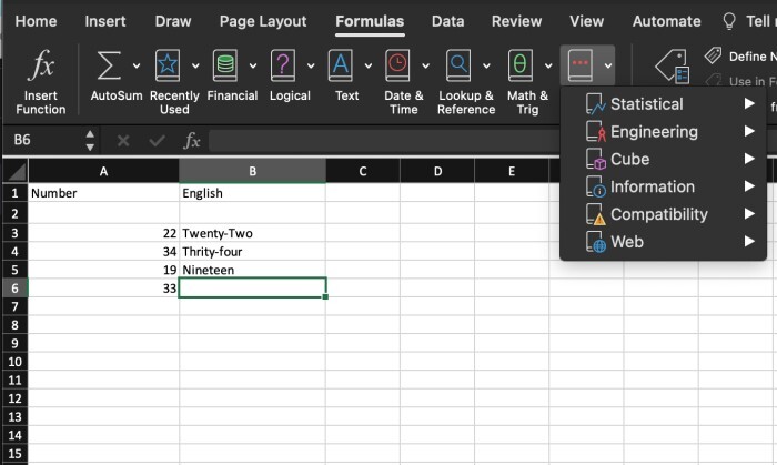 現在可以使用與使用內建函式相同的方式在 Excel 中使用自定義函式。在單元格中輸入"=FunctionName(Number)",其中“FunctionName”是您要使用的自定義函式的名稱,“Number”是要轉換的數字。