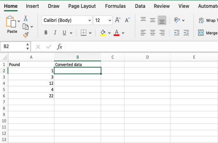 啟動 Excel,然後建立您的工作表:開啟您希望執行轉換的 Excel 工作表,無論是新的還是已存在的。請務必選擇一列或單元格來輸入磅值的資料。