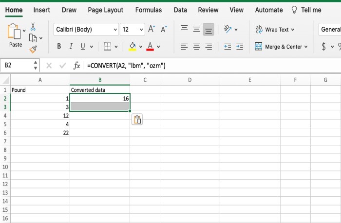 使用轉換公式:透過將磅值乘以 16,您可以將磅轉換為盎司。如果磅值在單元格 A1 中,則可以在您希望顯示盎司轉換結果的單元格中插入 Excel 公式“=A1*16”。對於克,使用公式“=A1*453.592”,對於千克,使用公式“=A1*0.45359237”。