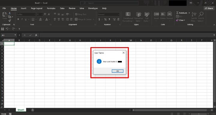 Sub InsertWindowsUsername() Dim UserName As String UserName = Environ("UserName") MsgBox "Your user name is " & UserName, vbInformation, "User Name" 'Window's UserName is inserted in the active cell ActiveCell.Value = UserName End Sub
