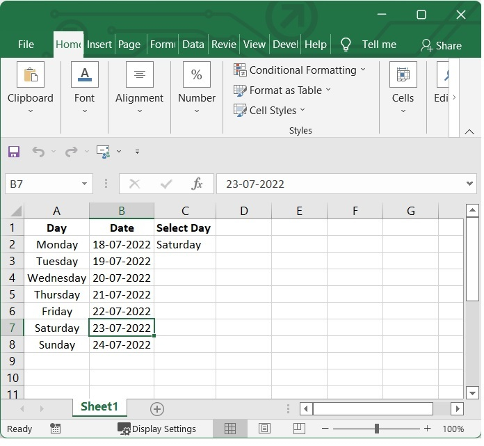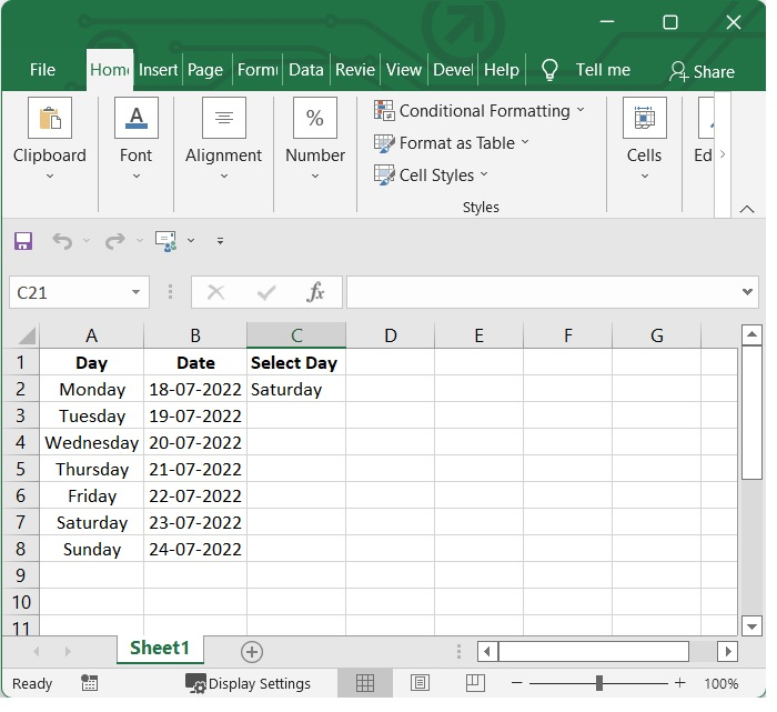 在我們的示例中,我們在Excel表格中列出了日期和星期幾,並有一個下拉列表包含從星期一到星期日的日期。請參見下圖。