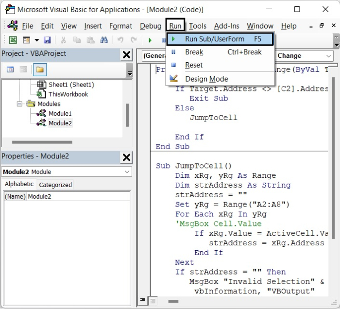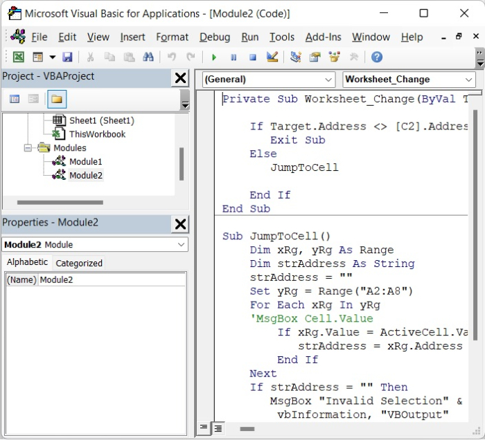 在上面的程式碼中,我們添加了單元格區域A2:A8,在“Target.Address <> [C2].Address”中,C2是建立下拉列表的單元格。請根據您的需要更改這些單元格。