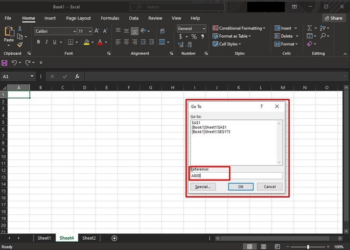 作為一條替代路線,我們可以嘗試按Ctrl + G(或F5)直接訪問“轉到”對話方塊,並在“引用”欄位中鍵入所需列或行末端單元格的引用。