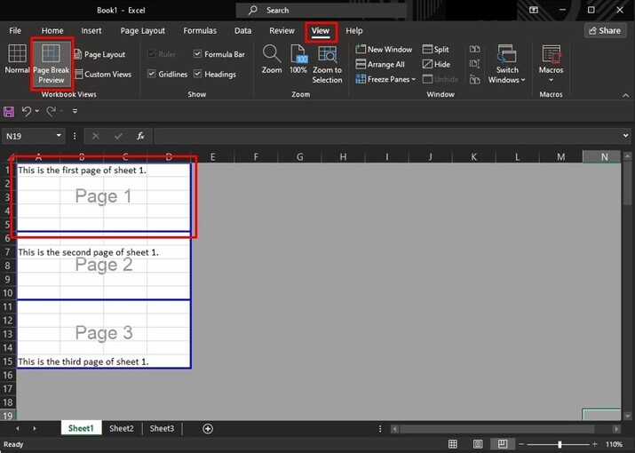 轉到頂部功能區中的“檢視”選項卡。找到並單擊“分頁預覽”。此檢視允許您視覺化每頁列印的邊界線。使用游標識別並拖動藍色的分頁線,以定義每張表中應在一個列印輸出中捕獲哪些部分。如有必要,重複步驟 iv,根據需要對所有工作表應用調整。