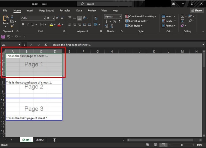 列印每張表的首頁——完成所有自定義後,現在可以解決僅列印每個工作表的第一頁的問題。選擇整個“第 1 頁”部分,如下所示: