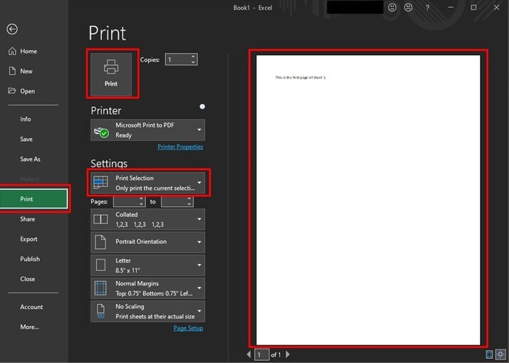 最終視窗將類似於下面的視窗,它列印 Excel 中所選相應工作表的第一頁。