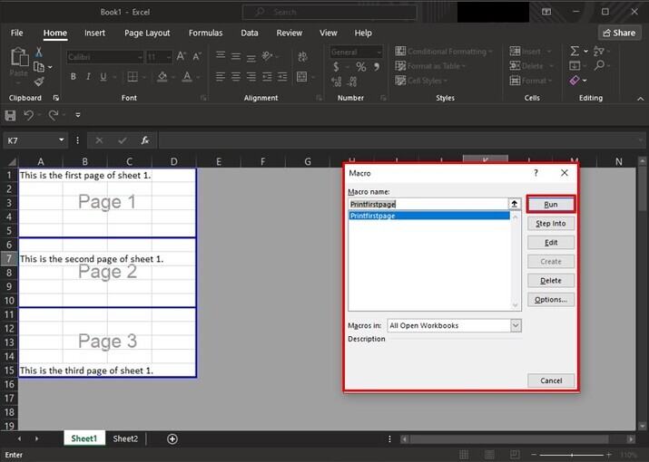 關閉編輯器並透過按 ALT + F8 顯示宏,選擇“Printfirstpage”,然後按“執行”按鈕。