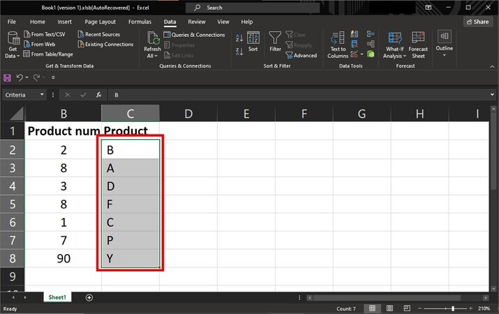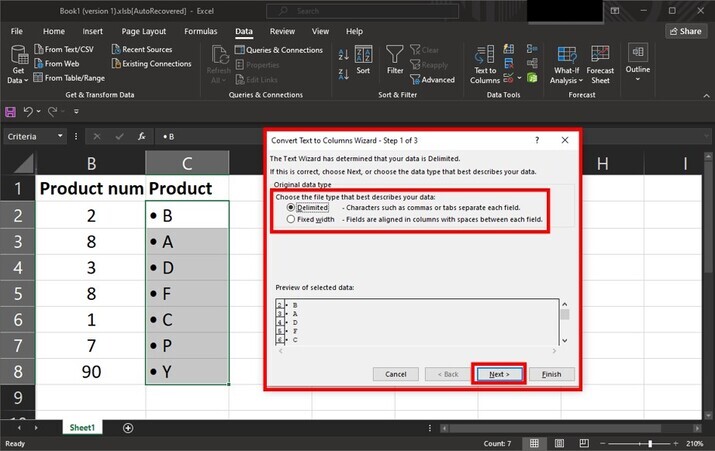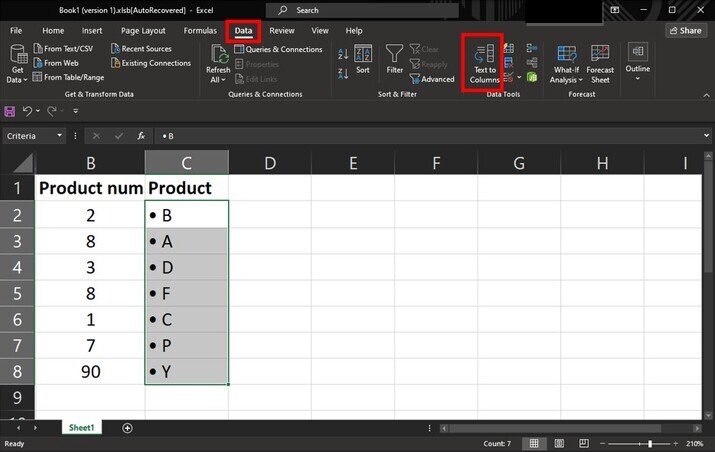 “文字到列”主要用於根據分隔符拆分單元格內容;令人驚訝的是,它還可以有效地幫助刪除不需要的編號或專案符號。在Excel工作表中,突出顯示目標列。