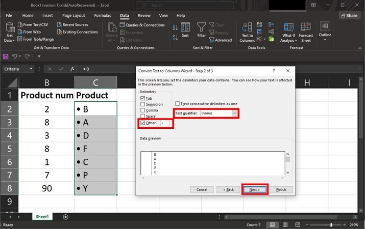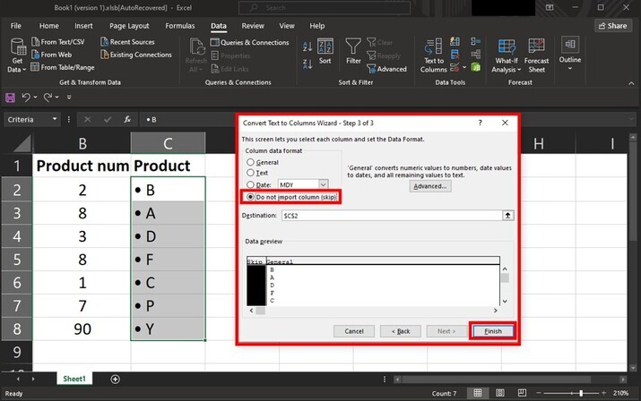 單擊“完成”。此操作通知Excel每個單元格包含單個值,而不是由專案符號或編號分隔的部分。因此,不需要的字元將被完全刪除。