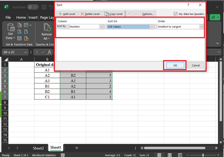 上述步驟將開啟一個排序對話方塊。然後轉到列標籤,轉到“排序依據”標籤,選擇“數字”,轉到“排序依據”,選擇“單元格值”選項。之後單擊“順序”標籤,並單擊“從小到大”選項。之後單擊“確定”按鈕。下面提供參考快照。