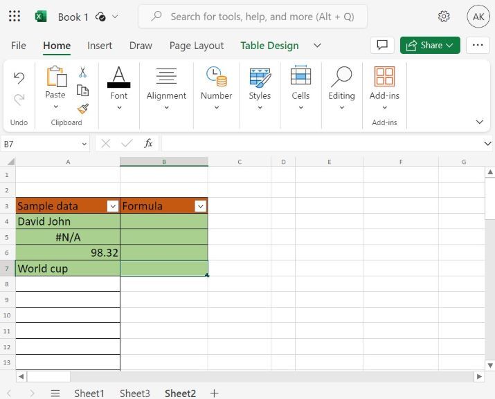 您需要建立一個包含兩列的表,命名為“示例資料”和“公式”。在第一列中輸入一些混合條目,如下面的圖片所示: