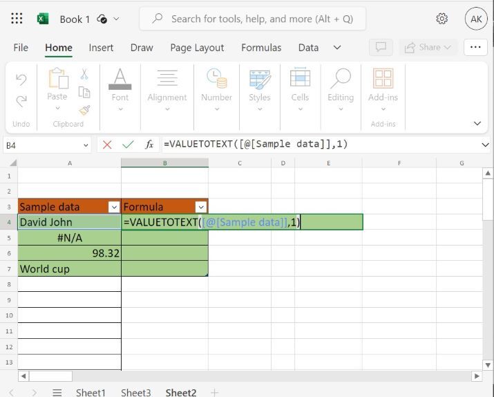 如上圖所示,應用VALUETOTEXT函式後,只有文字資料“David John”和“World Cup”用雙引號括起來,而其他示例資料保持不變。