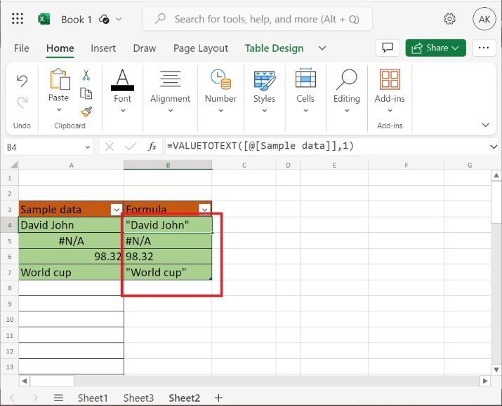 在B4單元格中輸入公式=VALUETOTEXT([@[示例資料]],1)。在這裡,我們在函式的第二個引數中使用嚴格的格式化值1。評估表中的公式非常有趣。如果VALUETOTEXT公式寫在單個單元格中,則相同的公式將自動應用於該列的其餘單元格。