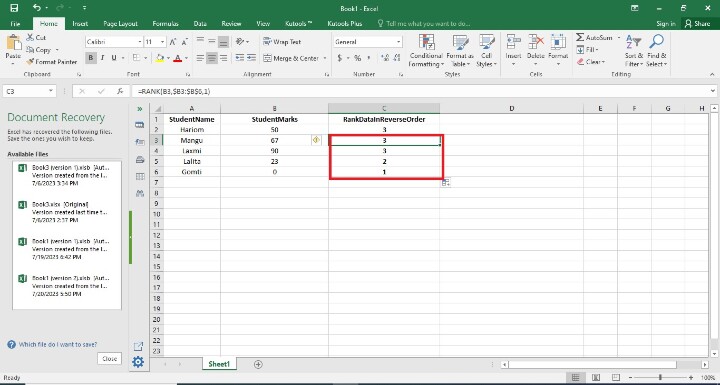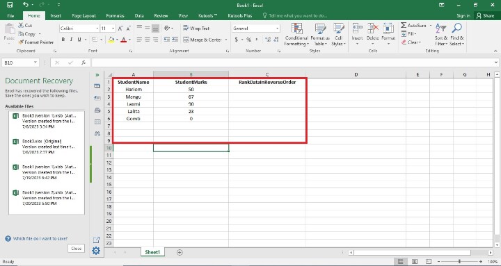 在此步驟中,使用者透過將填充柄拖動到使用者希望排名顯示的最後一個單元格來查詢其餘的 **反向排序資料**單元格(它位於該行右下角的一個小正方形)。在此步驟中,使用者必須檢視反向排序的結果。以下是此步驟的螢幕截圖。