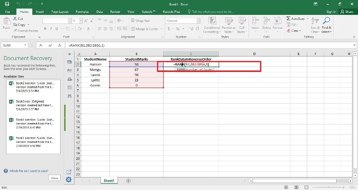 在此步驟中,使用者在 C2 單元格中輸入公式,即 =RANK(B2,$B2:$B$6,1)。以下是此步驟的螢幕截圖。