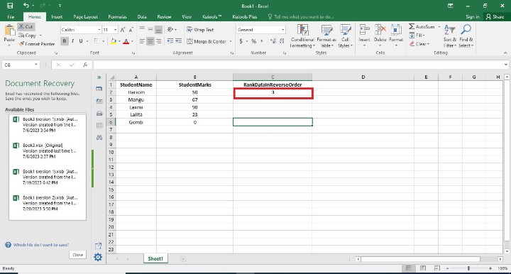 要查詢 **反向排序資料**列的排名,請按 Enter 鍵。單元格將顯示排名。以下是此步驟的螢幕截圖。