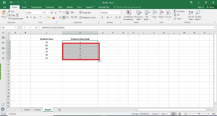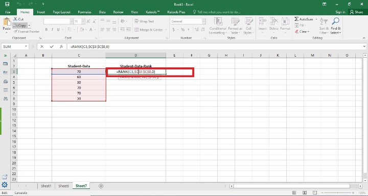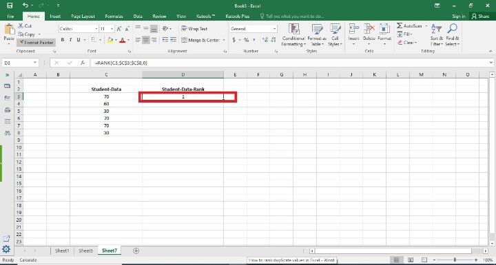 在此步驟中,使用者在單元格D2中建立了另一列,即“學生資料排名”。之後,他們應用公式=RANK(C3,$C$3:$C$8,0)。以下是此步驟的螢幕截圖。