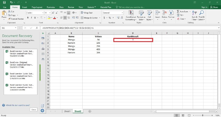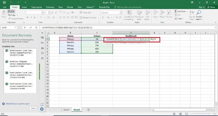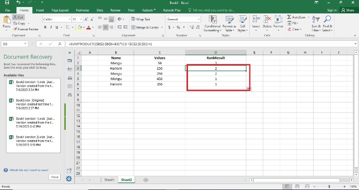 在上一步驟中,使用者建立了三列,在此步驟中,使用者在D2單元格中輸入公式,即=SUMPRODUCT(($B$2:$B$6=B2)*(C2<$C$2:$C$6))+1。以下是此步驟的螢幕截圖。