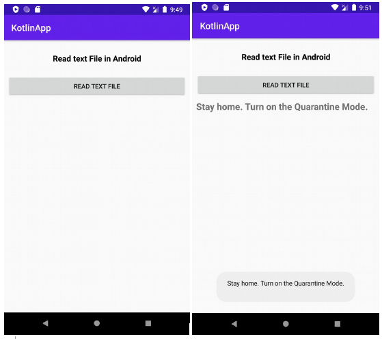 <?xml version="1.0" encoding="utf-8"?> <RelativeLayout xmlns:android="http://schemas.android.com/apk/res/android" xmlns:tools="http://schemas.android.com/tools" android:layout_width="match_parent" android:layout_height="match_parent" android:padding="8dp" tools:context=".MainActivity"> <Button android:id="@+id/button" android:layout_width="match_parent" android:layout_height="wrap_content" android:layout_centerHorizontal="true" android:layout_marginTop="70dp" android:onClick="readTextFile" android:text="Read Text File" /> <TextView android:layout_width="match_parent" android:layout_height="wrap_content" android:layout_marginTop="20dp" android:text="Read text File in Android" android:textAlignment="center" android:textColor="@android:color/background_dark" android:textSize="18sp" android:textStyle="bold" /> <TextView android:id="@+id/textView" android:layout_width="match_parent" android:layout_height="wrap_content" android:layout_below="@id/button" android:layout_marginTop="10dp" android:textSize="20sp" android:textStyle="bold" /> </RelativeLayout>