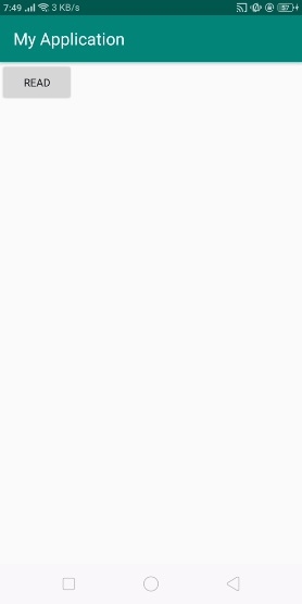 <?xml version = "1.0" encoding = "utf-8"?> <LinearLayout xmlns:android = "http://schemas.android.com/apk/res/android" xmlns:tools = "http://schemas.android.com/tools" android:layout_width = "match_parent" android:layout_height = "match_parent" tools:context = ".MainActivity" android:orientation = "vertical"> <Button android:id = "@+id/read" android:text = "read" android:layout_width = "wrap_content" android:layout_height = "wrap_content" /> <TextView android:id = "@+id/output" android:layout_width = "wrap_content" android:textSize = "25sp" android:layout_height = "wrap_content" /> </LinearLayout>
