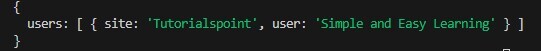 { "users":[ { "site":"Tutorialspoint", "user": "Simple and Easy Learning" } ] }