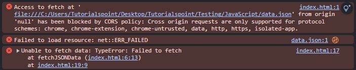 如果 JSON 檔案不在伺服器上,則會丟擲如下所示的錯誤。因此,我們建議您在 JSON 檔案位於伺服器上時使用此方法。