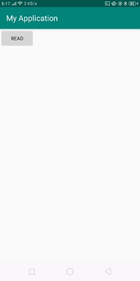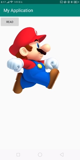 <?xml version = "1.0" encoding = "utf-8"?> <LinearLayout xmlns:android = "http://schemas.android.com/apk/res/android" xmlns:tools = "http://schemas.android.com/tools" android:layout_width = "match_parent" android:layout_height = "match_parent" tools:context = ".MainActivity" android:orientation = "vertical"> <Button android:id = "@+id/read" android:text = "read" android:layout_width = "wrap_content" android:layout_height = "wrap_content" /> <ImageView android:id = "@+id/imageView" android:layout_width = "300dp" android:layout_height = "300dp" /> </LinearLayout>
