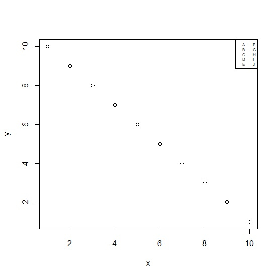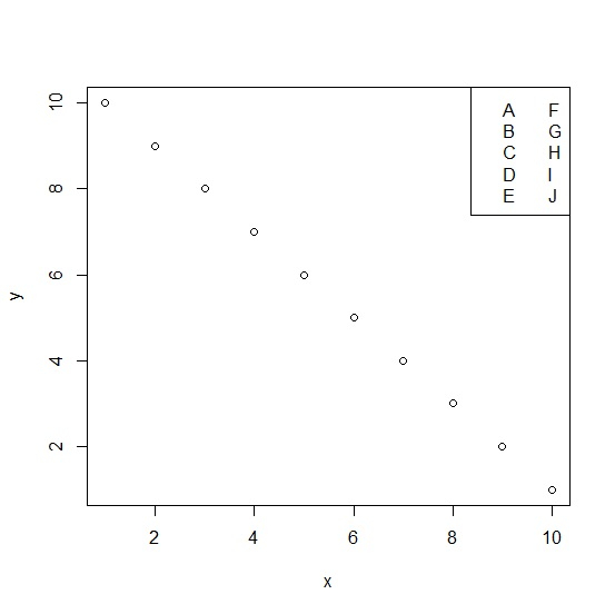 y<-10:1 plot((x,y) legend("topright",legend=LETTERS[1:10],ncol=2)輸出