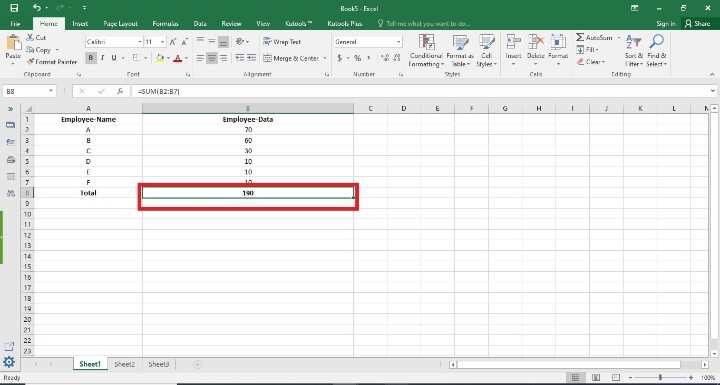 此步驟中,使用者可以看到Sheet1中**員工資料**列的總和已計算出來。以下是此步驟的螢幕截圖。