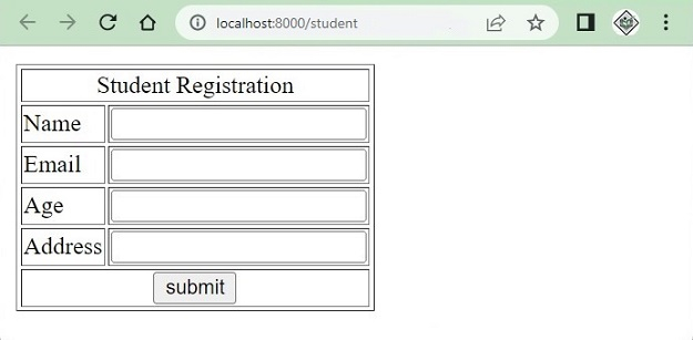 <html> <head> <title>Student Form</title> </head> <body> @if (count($errors) > 0) <div class = "alert alert-danger"> <ul> @foreach ($errors->all() as $error) <li>{{ $error }}</li> @endforeach </ul> </div> @endif <?php echo Form::open(array('url'=>'/student')); ?> <table border = '1'> <tr> <td align = 'center' colspan = '2'>Student Registration</td> </tr> <tr> <td>Name</td> <td><?php echo Form::text('name'); ?></td> </tr> <tr> <td>Email</td> <td><?php echo Form::text('email'); ?></td> </tr> <tr> <td>Age</td> <td><?php echo Form::text('age'); ?></td> </tr> <tr> <td>Address</td> <td><?php echo Form::text('address'); ?></td> </tr> <tr> <td align = 'center' colspan = '2'><?php echo Form::submit('submit'); ?></td> </tr> </table> </body> </html>