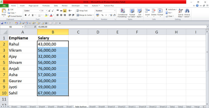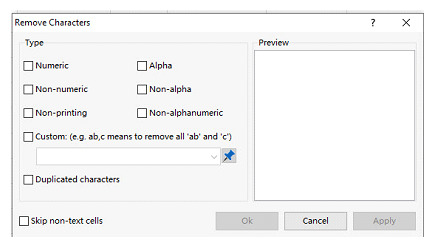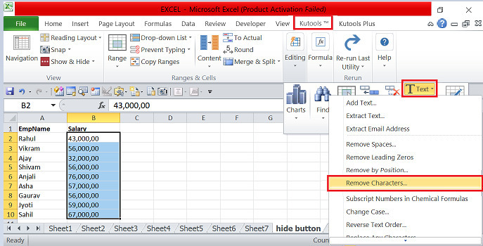 功能區資料集中提供的“查詢和替換”對話方塊很有用,它具有多個選項可用於刪除資料中存在的特殊字元。使用者建立了包含逗號的員工工資,使用者必須以不同的方式刪除這些逗號。我們可以使用Ku-tools選項卡和“刪除字元”選項卡來刪除字元,這將同時刪除所有逗號。他們必須從功能區中選擇重要選項並更新資料。