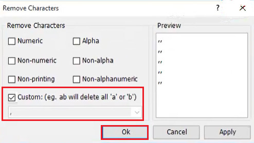 在對話方塊中,將游標放在**自定義**選項卡上並選中或啟用它,這將啟用輸入框,使用者必須在其中輸入要從表格中刪除的值,然後輸入逗號符號,這將顯示在**預覽**窗格中插入的所有逗號,然後單擊**確定**按鈕。在表格中,它將顯示所有單元格,並且它已刪除B列中的所有逗號,如下所示。