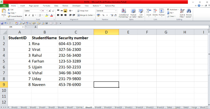 考慮Excel工作表。開啟Microsoft Excel表格,根據需要將資料從A1單元格插入到C9單元格,如下所示。