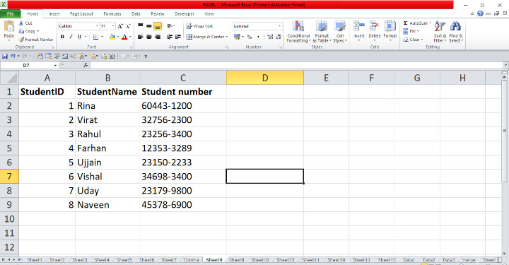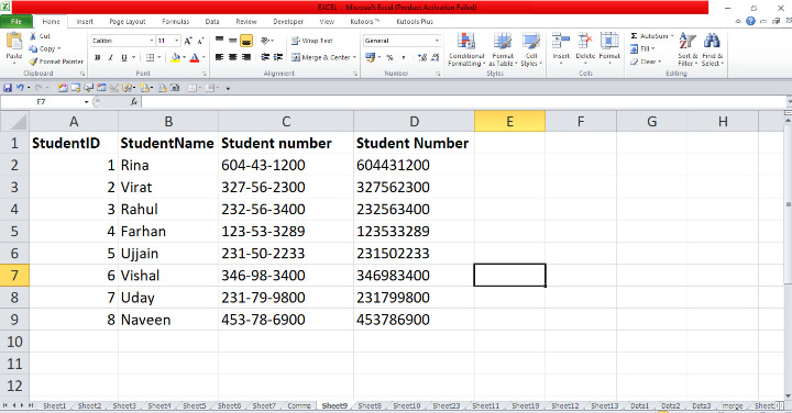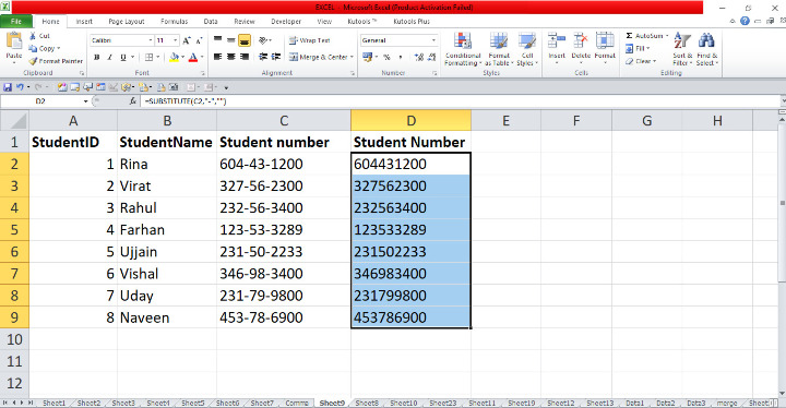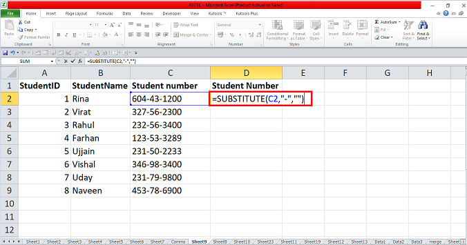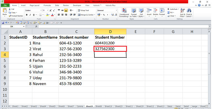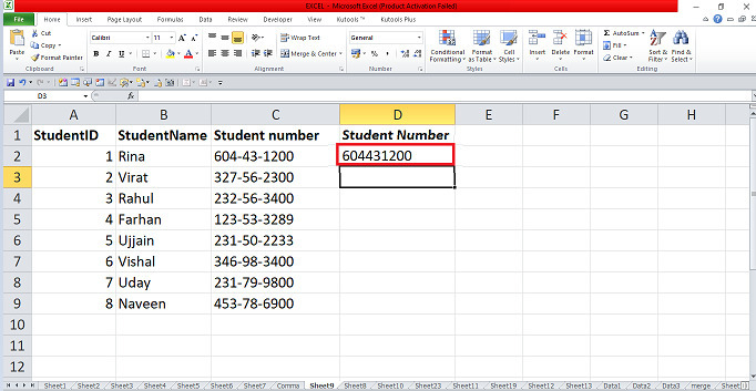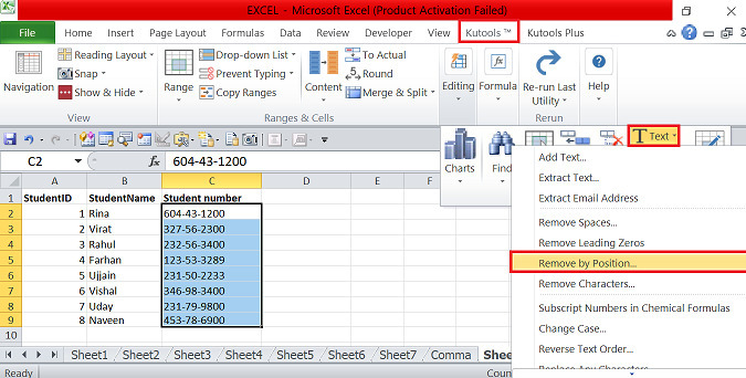 藉助使用者自定義公式,使用者可以消除單元格中存在的所有短橫線。使用者建立了帶有短橫線的學生編號,使用者必須以不同的方式將其刪除。我們可以使用Ku-tools選項卡和“按位置刪除”選項卡刪除字元,這將同時刪除所有短橫線。他們必須從功能區中選擇重要的選項並更新資料。