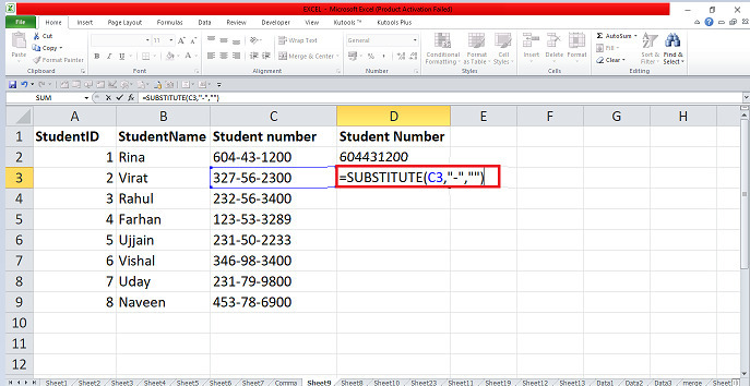 在Excel表格中,選擇C列以刪除SSN中的所有短橫線,將指標放在D3單元格中,輸入公式=SUBSTITUTE(C3,"-",""),然後按Enter鍵,這將顯示沒有短橫線的社保號碼。它將刪除單元格中的短橫線,如下所示。
