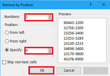 在對話方塊中,將指標放在“數字”選項卡中並鍵入1,然後啟用“指定”選項。在輸入型別中,輸入數字4,這將計算SSN中最右邊4位數字。它將在預覽窗格中顯示更新後的資料,然後單擊確定按鈕,如下所示。