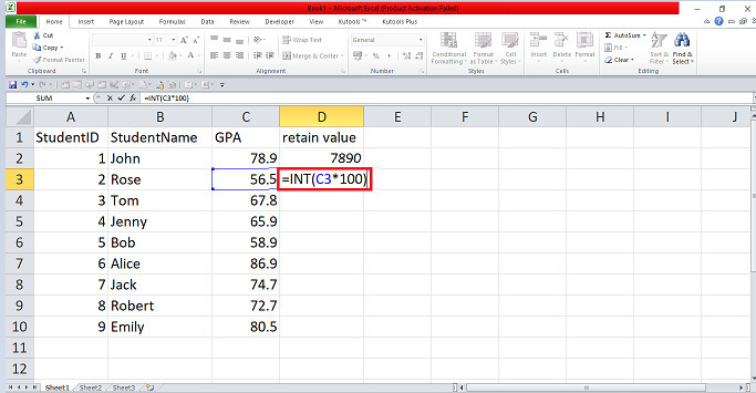 在Excel表格中,將指標放在單元格D3中,輸入公式以去除單元格C3的小數點。要輸入公式,必須選擇公式中存在的單元格,然後輸入公式=INT(C3*100),然後按Enter鍵,這將刪除單元格D3中學生成績的小數點,如下所示。