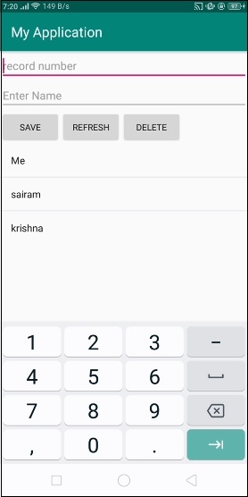 <?xml version="1.0" encoding="utf-8"?> <LinearLayout xmlns:android="http://schemas.android.com/apk/res/android" xmlns:tools="http://schemas.android.com/tools" android:layout_width="match_parent" android:layout_height="match_parent" tools:context=".MainActivity" android:orientation="vertical"> <EditText android:id="@+id/record" android:layout_width="match_parent" android:hint="record number" android:inputType="number" android:layout_height="wrap_content" /> <EditText android:id="@+id/name" android:layout_width="match_parent" android:hint="Enter Name" android:layout_height="wrap_content" /> <LinearLayout android:layout_width="wrap_content" android:layout_height="wrap_content"> <Button android:id="@+id/save" android:text="Save" android:layout_width="wrap_content" android:layout_height="wrap_content" /> <Button android:id="@+id/refresh" android:text="Refresh" android:layout_width="wrap_content" android:layout_height="wrap_content" /> <Button android:id="@+id/delete" android:text="Delete" android:layout_width="wrap_content" android:layout_height="wrap_content" /> </LinearLayout> <ListView android:id="@+id/listView" android:layout_width="match_parent" android:layout_height="wrap_content"> </ListView> </LinearLayout>
