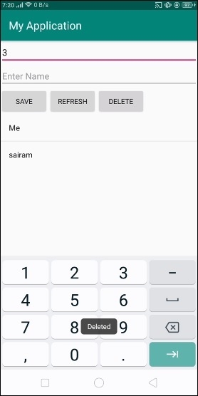 在上面的程式碼中,我們使用了名稱和記錄編號作為EditText,當用戶點選儲存按鈕時,它會將資料儲存到ArrayList中。點選帶有記錄ID的刪除按鈕即可從ListView中移除元素。