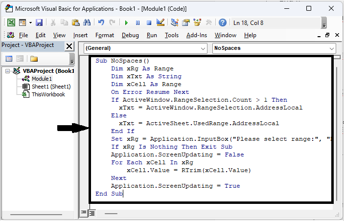 這裡我們將首先建立一個 VBA 模組來選擇單元格範圍以完成任務。讓我們來看一個簡單的過程,瞭解如何在 Excel 中刪除最後一個字元後的所有空格。