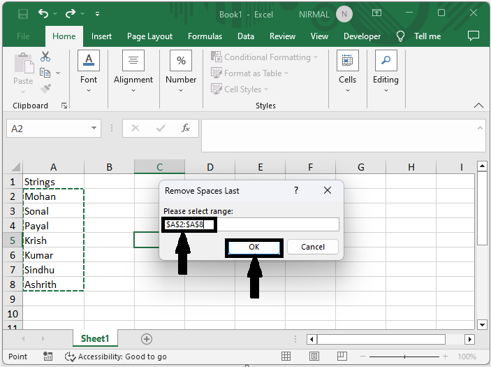 然後點選 F5 執行模組。然後選擇單元格範圍並點選“確定”以完成任務。然後您將看到最後一個字元後的所有空格都將被刪除。