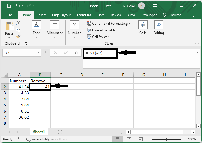 此公式將透過刪除小數點後的數字將小數轉換為整數。