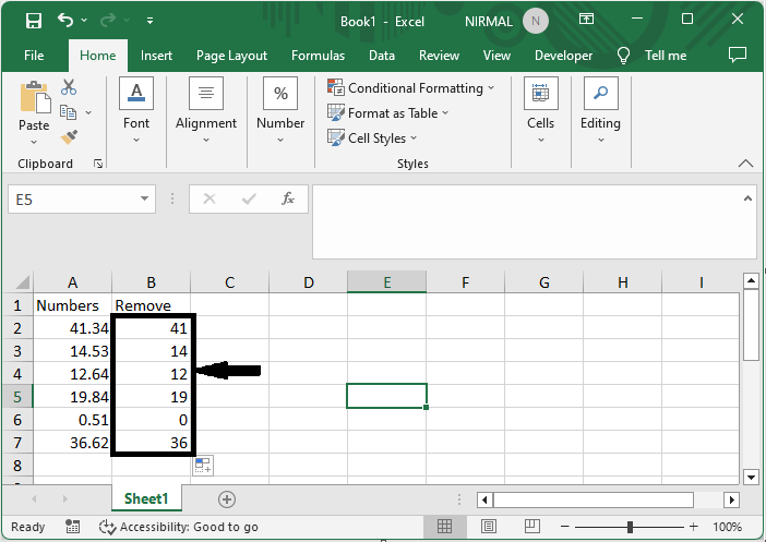 在這裡,我們將首先使用公式獲取任意一個值,然後使用自動填充柄完成任務。讓我們看看一個簡單的過程,瞭解如何在Excel中刪除小數點後的數字。